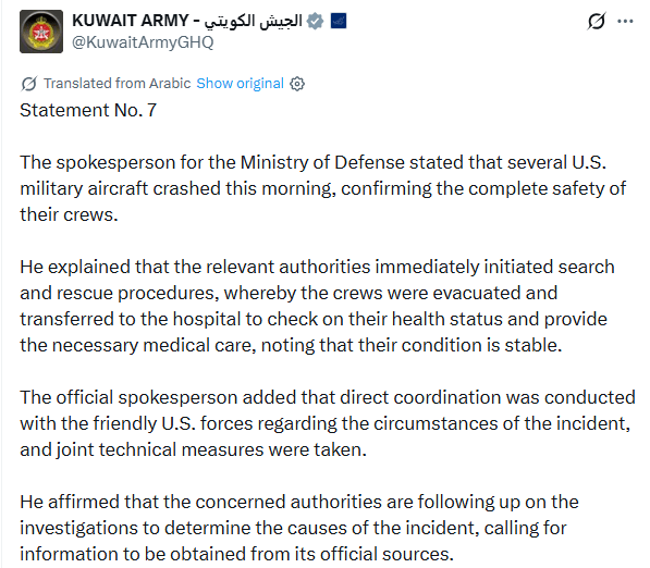 科威特国防部发言人3月2日在声明中称,当日上午多架美军飞机坠毁,并确认机组人员全部安全。声明称,科威特方面已就此次事件与美军直接协调,并采取联合技术措施,“有关部门正跟进调查,以确定事件原因”。