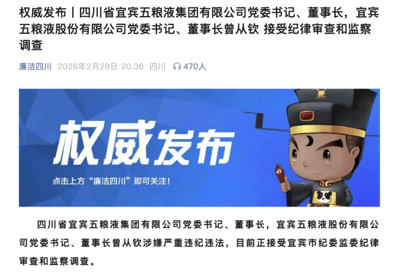据四川省纪委监委公众号“廉洁四川”2月28日消息,四川省宜宾五粮液集团有限公司党委书记、董事长,宜宾五粮液股份有限公司党委书记、董事长曾从钦涉嫌严重违纪违法,目前正接受宜宾市纪委监委纪律审查和监察调查。