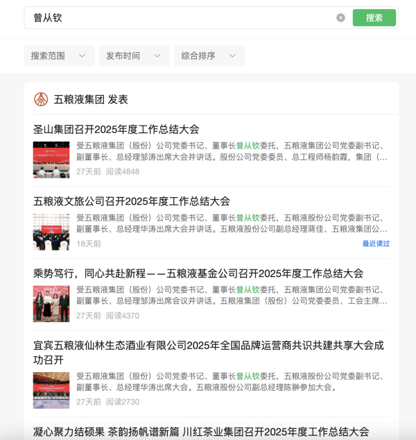 观察者网查阅后发现,五粮液集团官方微信公众号已搜索不到其相关内容,2月24日“春节收心会”的原文也已被紧急删除。目前,该公众号历史文章中,涉及曾从钦的仅剩“受曾从钦委托”的报道。