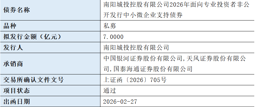 【大河财立方消息】3月2日,南阳城投控股有限公司2026年面向专业投资者非公开发行中小微企业支持债券项目获上交所通过。债券拟发行金额7亿元,承销商为银河证券、天风证券、国泰海通。