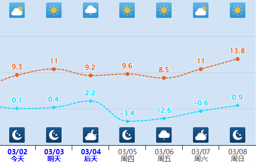 全市阴天转多云,北中部部分有小雨,最低气温-2~1℃,最高气温1~11℃。