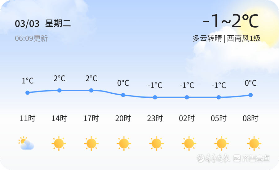 今天是3月3日,星期二,农历正月十五。多云转晴,气温在-1℃到2℃之间,西南风1级,空气湿度较高,PM2.5指数为150。各区天气总体平稳,市民出行请注意保暖和防风。