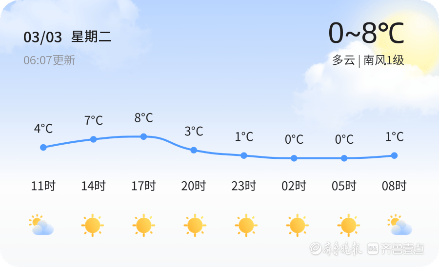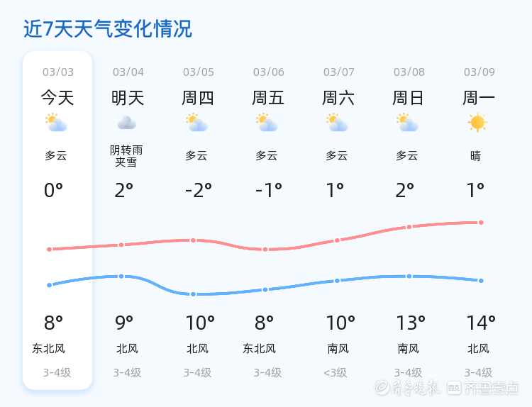 今天是3月3日,星期二,农历正月十五。聊城市今天以多云天气为主,气温在0℃到8℃之间,当前温度为1.6℃,南风1级,空气湿度较高,达到92%。整体来看,各区天气情况较为一致,均为多云,温差不大,适合市民外出活动。nn预计明天,聊城市的天气将有所变化,阴转雨夹雪,气温略有上升,最低气温2℃,最高气温9℃,北风3-4级。与今天相比,明天的天气将转为阴雨夹雪,提醒市民出行时注意携带雨具,做好防寒保暖措施。nn未来三天,聊城市的天气趋势呈现多变特点。周四多云,气温将下降至-2℃到10℃,北风3-4级;周五多云,气温回升至-1℃到8℃,东北风3-4级;周六多云,气温进一步回升至1℃到10℃,南风风力较小。市民需注意气温变化,及时增减衣物,尤其是周四早晨气温较低,可能出现霜冻,建议市民做好防护措施。nn温馨提示