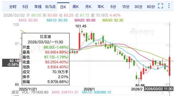 3月2日开盘后,比亚迪(002594.SZ)迎大涨,股价盘中涨幅一度接近5%。截至当日午间休盘,比亚迪股价涨幅为4.4%,报93.25元/股。比亚迪股份(01211.HK)当日涨幅同样明显,一度接近4%。