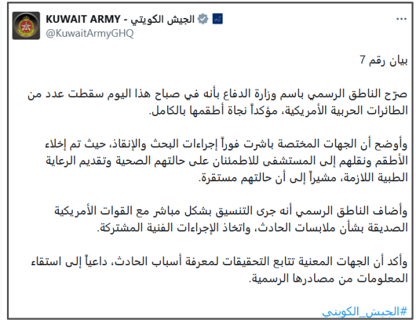 同日稍早前,科威特军队总参谋部通过社交媒体发布国防部发言人声明称,当天上午有多架美国军用飞机坠毁,所有机组人员均已安全获救。