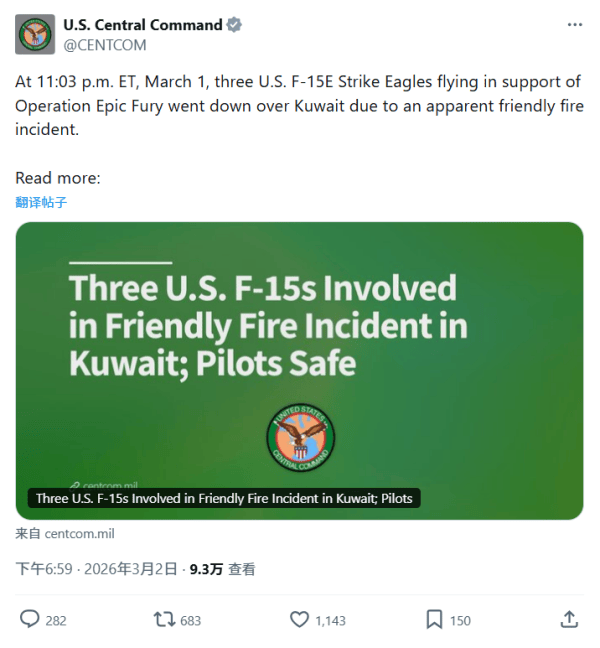 3月2日,美国中央司令部发布声明证实,有三架F-15E战斗机在科威特上空遭友军火力误击坠毁。