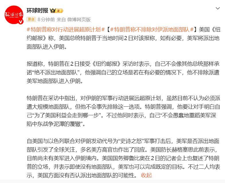报道称,特朗普在2日接受《纽约邮报》采访时表示,自己不会像其他总统那样承诺“绝不派出地面部队”,他强调自己的立场是若在有必要的情况下,他不排除派遣美军地面部队进入伊朗。