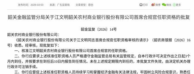 2026年3月3日,根据国家金融监督管理总局消息,《韶关农村商业银行股份有限公司关于江文明同志首席合规官任职资格审核的请示》获得通过,批复江文明韶关农村商业银行股份有限公司首席合规官的任职资格。