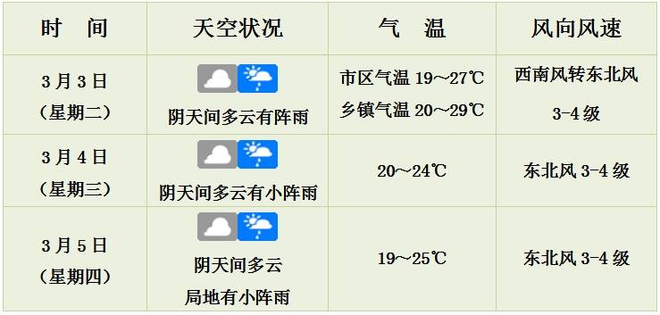 3月3日,受冷空气影响,有阵雨或雷阵雨,局地可能伴有短时雷雨大风等强对流天气;4日~5日,多云间阴天,局地有小阵雨。最低气温18~20℃,最高气温25~27℃。