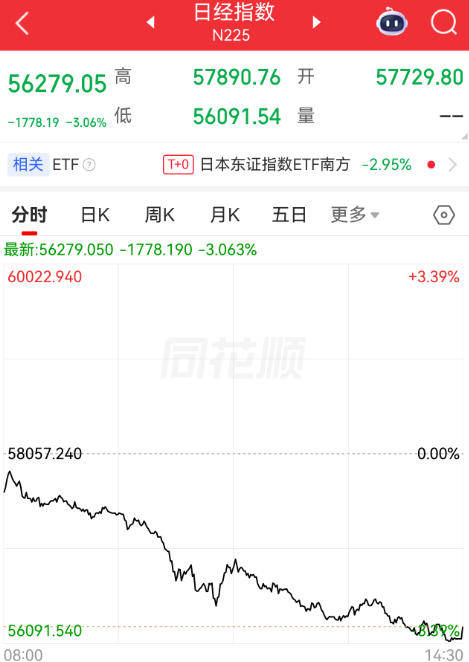 同日,日经225指数连续第二天下跌,3日收盘跌3.06%,跌破57000点关口。