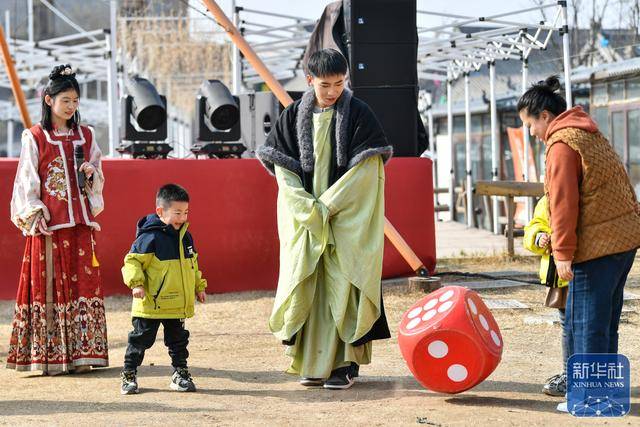 ↑ 2月25日,游客在山西太原古县城参加趣味活动。