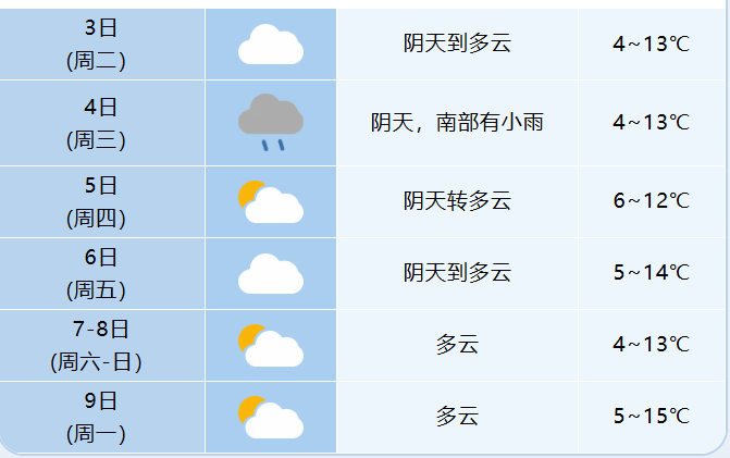 5日(周四):全省阴天,大别山区和淮河以北部分地区有小雨。