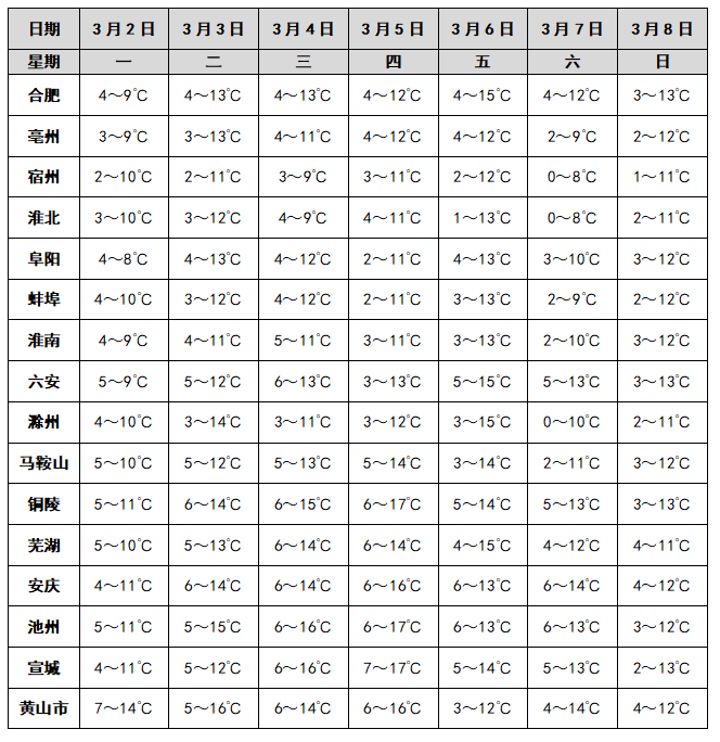 气温预报:未来一周全省大部分地区最高气温普遍低于16℃。9-11日我省气温逐渐升高,11日最高气温:沿淮淮河以北16~18℃;淮河以南19~21℃。