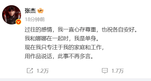 3月3日晚,张杰发文回应此事:“过往的感情,我一直心存尊重,也祝各自安好。我和娜娜在一起时,我是单身。”