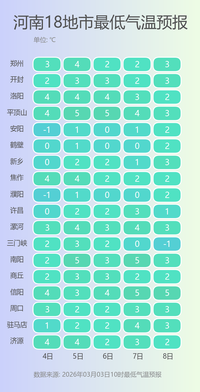 相对于最高气温,最低气温则较为稳定,大部地区基本维持在1-3℃,早晚寒凉仍在,仍需做好保暖。
