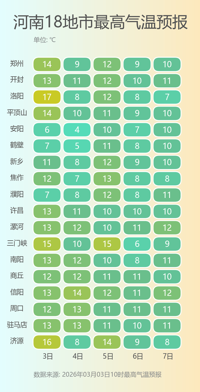 今后五天我省最高气温呈现出升-降-升-降的走势:今天除了北部地区,多地最高气温预计升至10℃以上,明日受弱冷空气影响,西部和北部最高气温下降,5日气温略有回升,6-7日气温再下降。