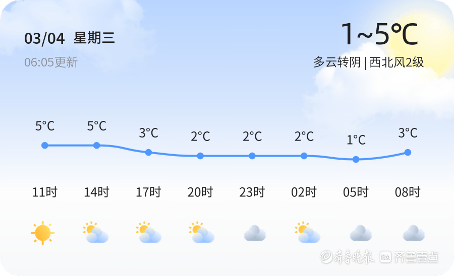 今天是3月4日,星期三,农历正月十六。威海市今天天气多云转阴,气温在1℃到5℃之间,西北风2级,空气湿度85%。PM2.5指数为148,空气质量为中度污染,建议市民减少户外活动,敏感人群应佩戴口罩。出行时请注意保暖,防范降温对身体的影响。