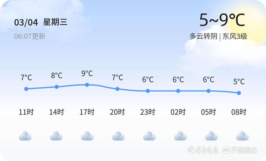 今天是2026年3月4日,星期三,农历正月十六。聊城市今日天气多云转阴,气温介于5℃到9℃之间,东风3级,空气湿度较高,为98%。当前温度2.3℃,空气质量指数为120,属于轻度污染,提醒市民注意防护。全市各区天气状况一致,均为多云转阴。明日天气预计为阴天,气温稍有上升,介于1℃到10℃之间,北风3-4级。相较于今日,明日的阴天可能带来更明显的降温,市民需做好防风保暖准备。未来三天,聊城市天气以多云为主,气温波动较大,最低气温可达-1℃,最高气温11℃。市民需根据天气变化及时调整着装,尤其是早晚温差较大,容易引发感冒。温馨提示