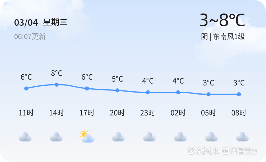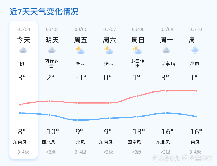 今天是3月4日,星期三,农历正月十六。临沂市今日天气阴沉,气温介于3℃至8℃之间,东南风1级,空气湿度较高,达到89%,PM2.5指数为138。各区气温基本持平,整体天气状况较为平稳。nn明日,临沂市天气将由阴转为多云,气温略有上升,预计最低气温2℃,最高气温10℃。风向转为西北风,风力小于3级,天气较今日有所改善。nn未来三天,临沂市气温将呈现波动趋势,最高气温可达10℃,最低气温将降至-1℃。周五多云,北风3-4级;周六多云,东南风小于3级;周日多云转阴,西南风小于3级。特别提醒市民,周五风力较大,出行请注意防范。下周二将出现小雨天气,建议市民提前做好出行规划,随身携带雨具。nn温馨提示
