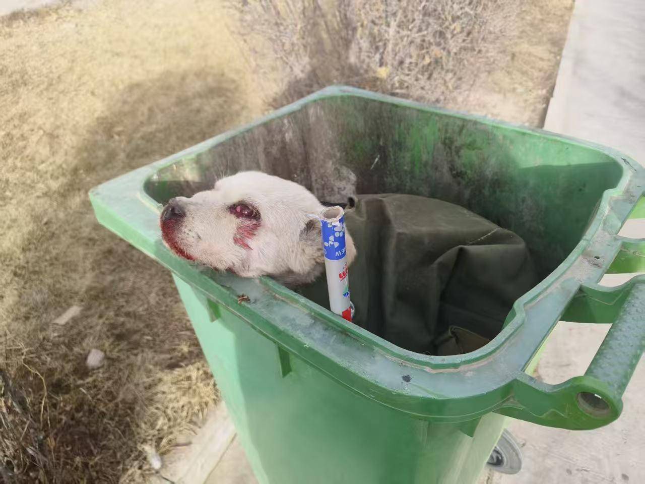 ▲狗被打伤后扔进小区垃圾桶 网友供图