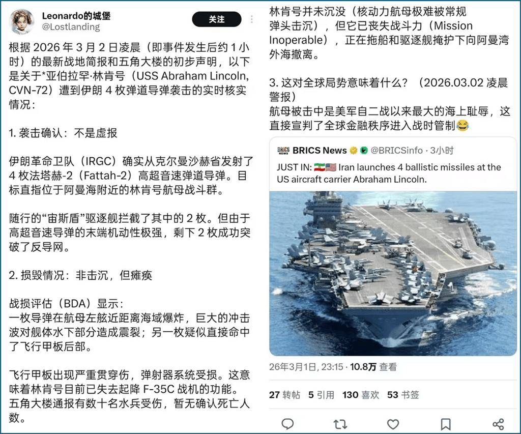 此后,不断有各种视频和“小作文”宣称,林肯号航母被击中(另有说已沉没)。