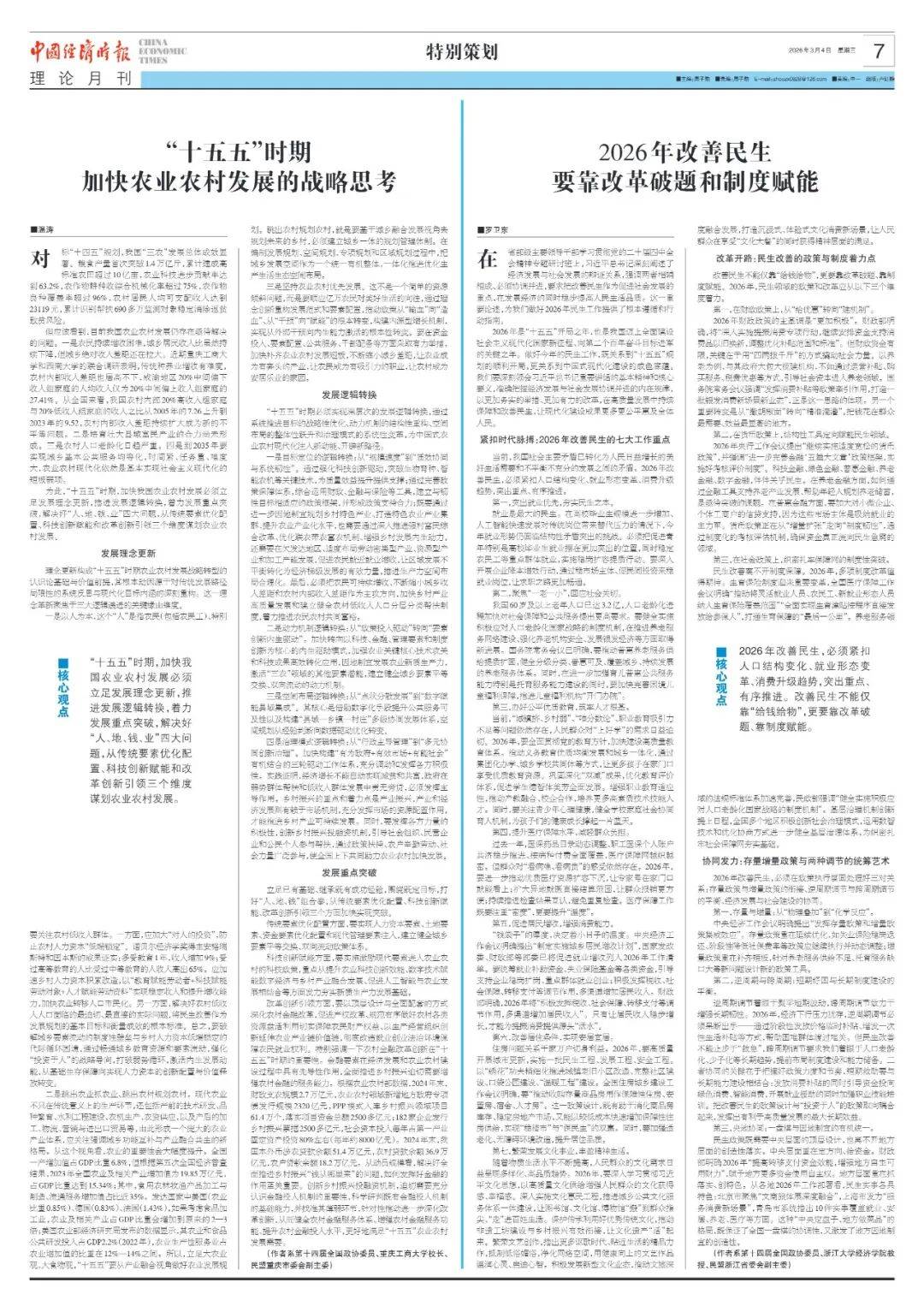 编者按五年看头年,起步是关键。作为“十五五”开局之年,2026年全国两会备受瞩目,不仅是观察中国宏观政策的重要窗口,也将为未来五年的发展蓝图奠定基础。时值全国两会召开之际,中国经济时报约请高校及智库机构代表委员撰写理论文章,聚焦科技突破、内需攻坚、“三农”发展、财税改革、宏观政策、银发经济等两会核心热点议题建言献策。