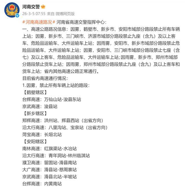 记者从河南省高速公路路警联合指挥中心了解到,截至3月5日7时55分,高速公路路况信息:因雾,鹤壁市、新乡市、安阳市域部分路段禁止所有车辆上站;因雾,新乡市、三门峡市、济源市域部分路段禁止九座(含九)及以上客车、危险品运输车、大件运输车上站;因雨雾,安阳市、新乡市域部分路段禁止危险品运输车、大件运输车上站;因雾,安阳市、三门峡市域部分路段禁止七座(含七)及以上客车、危险品运输车、大件运输车上站;因雨雾,新乡市、郑州市域部分路段禁止货车上站;因雨雾,郑州市域部分路段禁止九座(含九)及以上客车和货车上站;省内其他高速公路正常通行。
