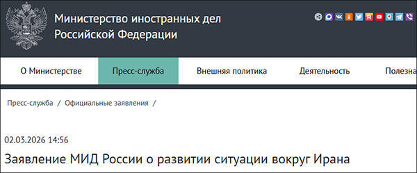当地时间3月2日,俄罗斯外交部网站就伊朗局势发表声明。