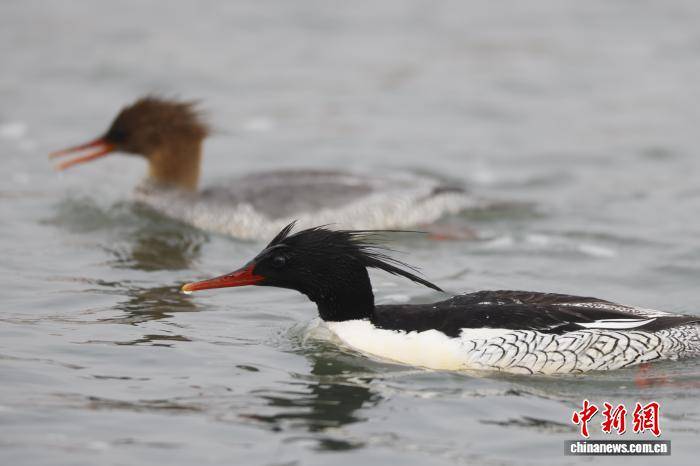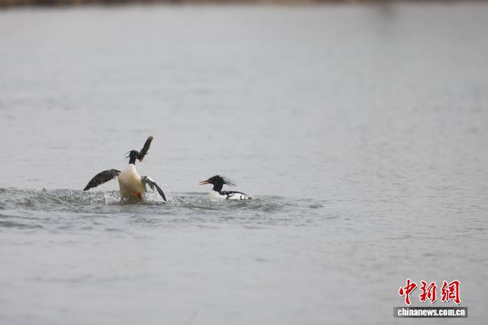 3月5日,河南省三门峡市卢氏县洛河湿地公园,被称为“鸟中大熊猫”的中华秋沙鸭在水中嬉戏、觅食。图为中华秋沙鸭在水中嬉戏。张明云 摄