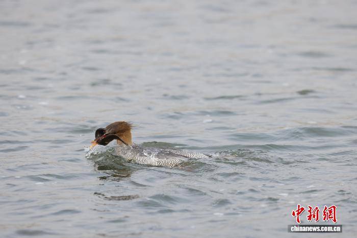 3月5日,河南省三门峡市卢氏县洛河湿地公园,被称为“鸟中大熊猫”的中华秋沙鸭在水中嬉戏、觅食。图为中华秋沙鸭在捕食。张明云 摄