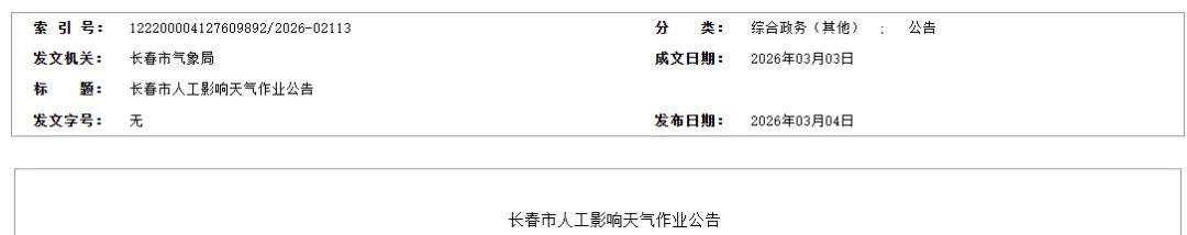 按照长春市2026年抗旱增雨(雪)和防雹减灾需求,定于2026年1月1日至2026年12月31日期间,根据天气情况,适时在长春市行政区域内开展地面火箭、高炮人工影响天气作业,以预防或减轻干旱、冰雹等气象灾害对我市农业生产造成的损失;同时最大限度开发利用空中云水资源,加强生态修复、生态建设、森林防火等保障性人工影响天气作业。