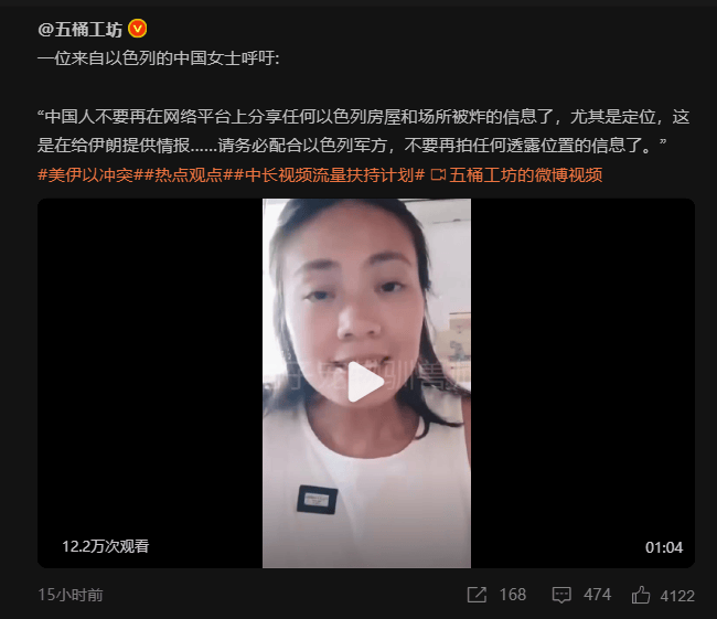 同时呢,有在以色列的所谓的“中国女士”(具体这是个什么人,想必是懂得都懂吧),还出来拍摄视频,要求中国网民不能再在网络平台上分享任何以色列被炸的信息,要求中国网民务必配合以色列军方。