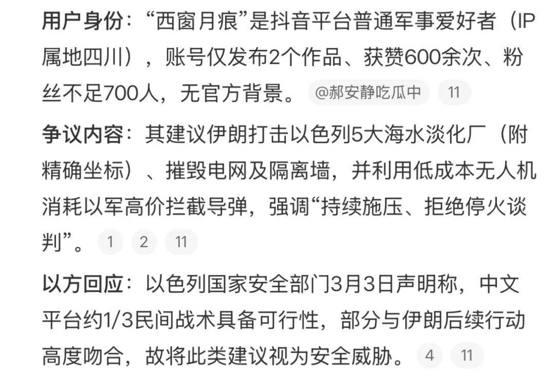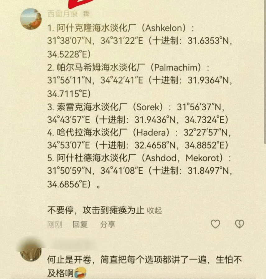 比如,有网友就给伊朗提建议,要把反击以色列和美国的重点,放到打击以色列的海水淡化厂上,还详细列出的以色列的那些海水淡化厂的精准坐标。