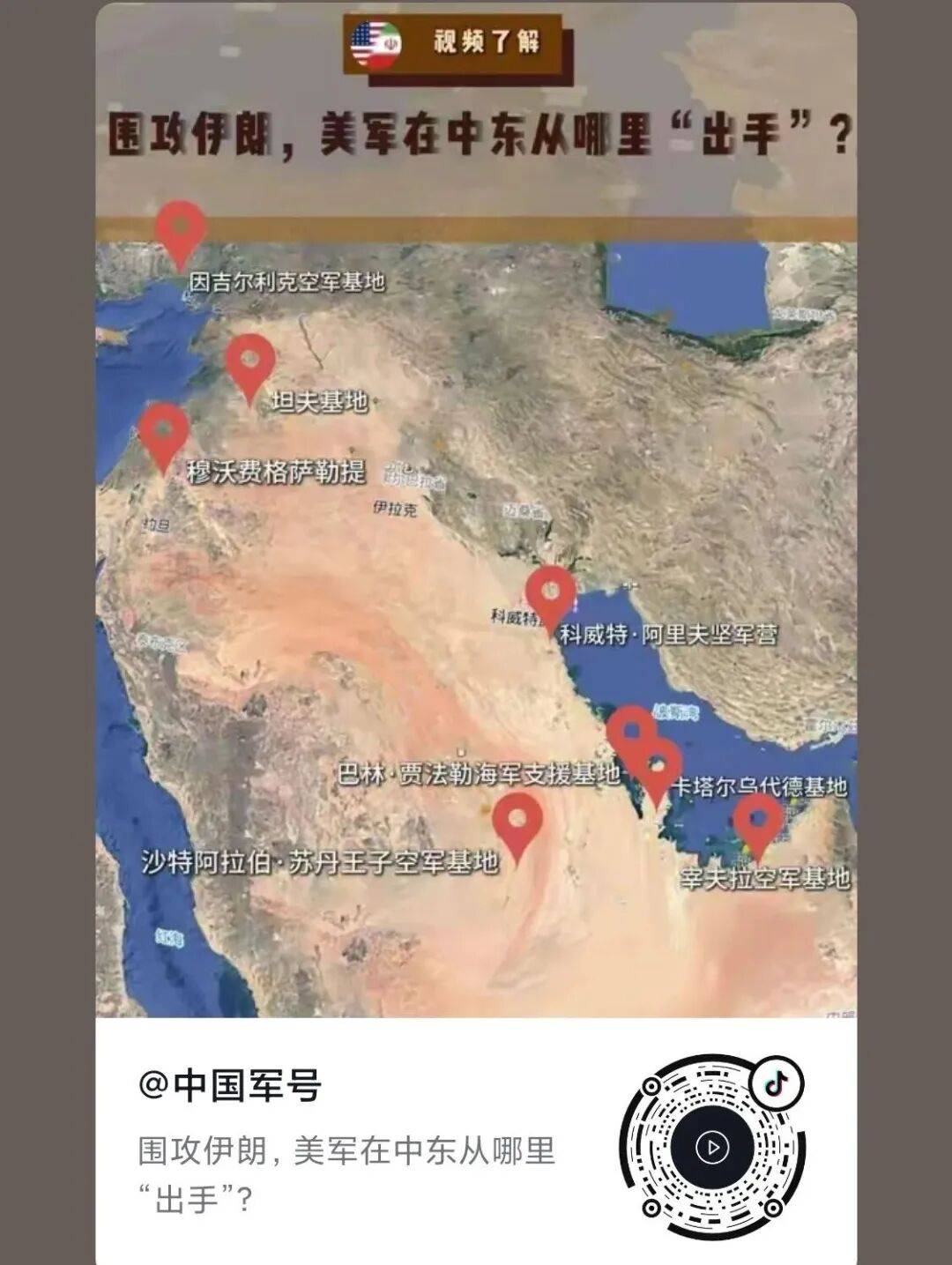而且,“中国军号”早就发布了科普视频,把美军在中东的军事基地标注的清清楚楚了。