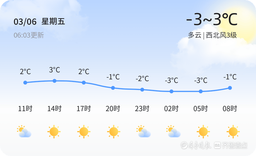 今天是3月6日,星期五,农历正月十八。潍坊市迎来多云天气,气温在-3℃至3℃之间,西北风3级,空气湿度为74%。PM2.5浓度为34微克/立方米,属于良好水平,适合户外活动。市民出行时建议穿着保暖,注意防风,早晚温差较大,需适时增减衣物。