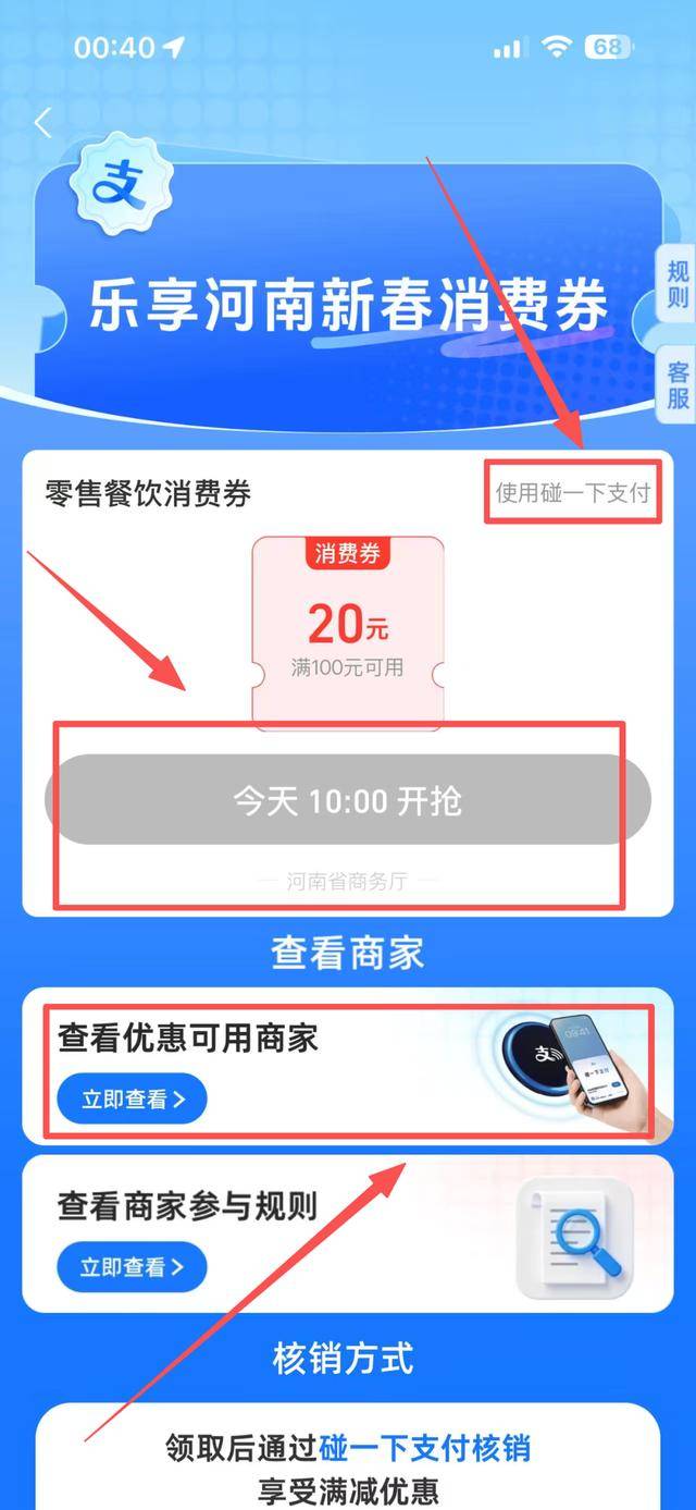 2️⃣支付宝消费券可通过“碰一下”支付核销。消费者在领取消费券后须在有效期内使用,逾期未使用自动作废。