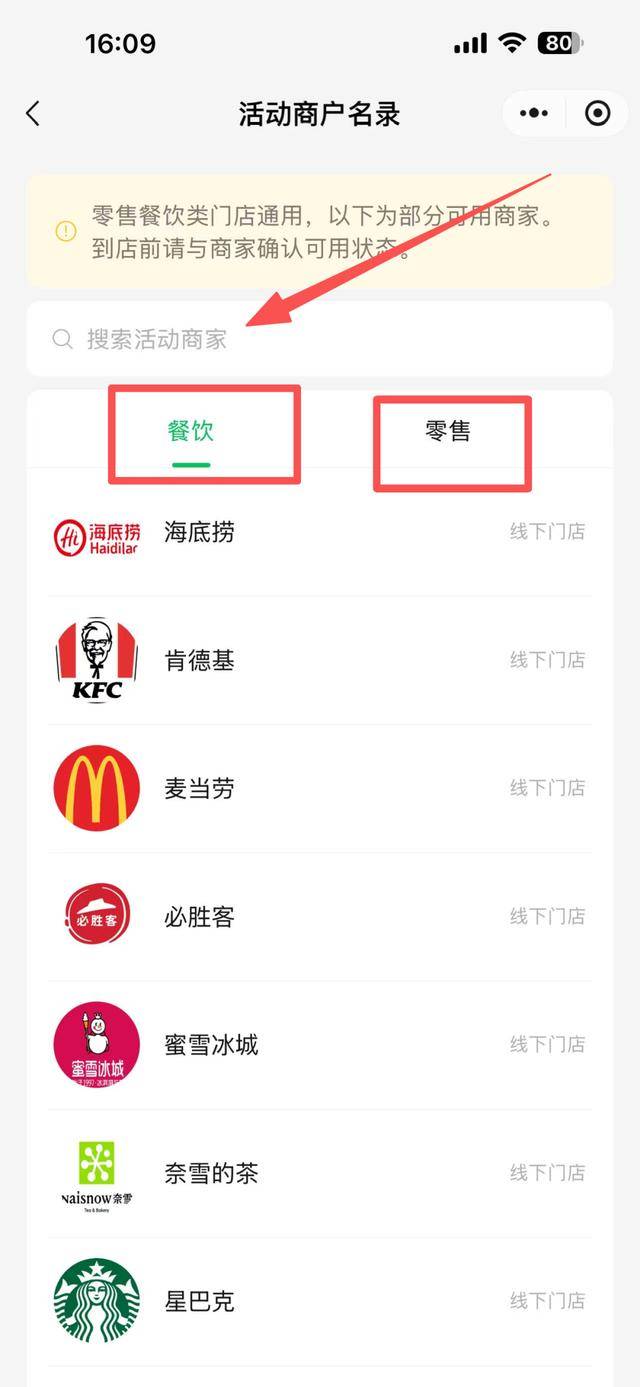 从上述入口进入小程序后,到对应领券时间,点击即可领取,点击下方【部分可用商家】,可查看适用商家,适用范围包含餐饮及零售,也可输入搜索想要查看的商家