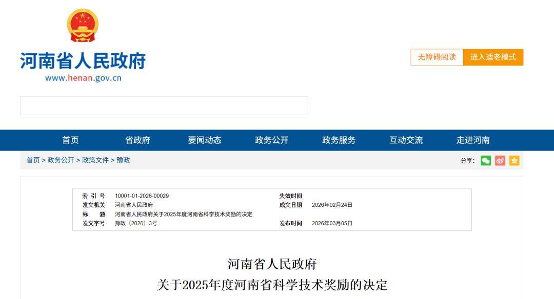 近日,河南省人民政府印发《关于2025年度河南省科学技术奖励的决定》,共评选出获奖项目(人选)309项(人),一批服务国家战略、支撑产业升级、保障粮食安全、彰显青年担当的科技成果脱颖而出。