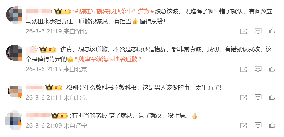 对于此次魏建军公开道歉,网友纷纷表示:“魏总自己发视频道歉,太实在了!”“敢作敢当”“道歉很诚恳”。