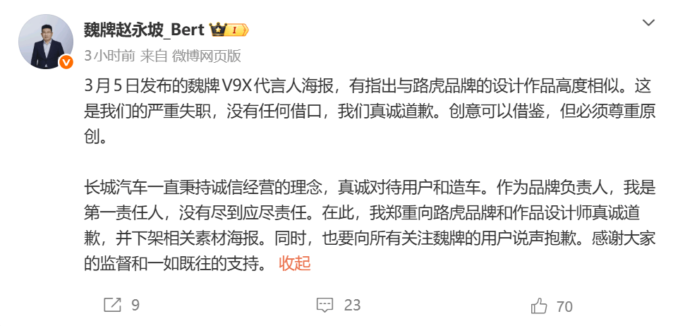 同期,长城汽车魏牌CEO赵永坡也在社交平台发文致歉称:“3月5日发布的魏牌V9X代言人海报,有指出与路虎品牌的设计作品高度相似。这是我们的严重失职,没有任何借口,我们真诚道歉。创意可以借鉴,但必须尊重原创。”
