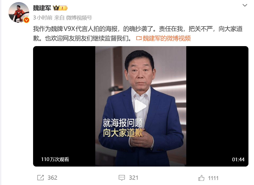 魏建军在配文中写道:“我作为魏牌V9X代言人拍的海报,的确抄袭了。责任在我,把关不严,向大家道歉。”