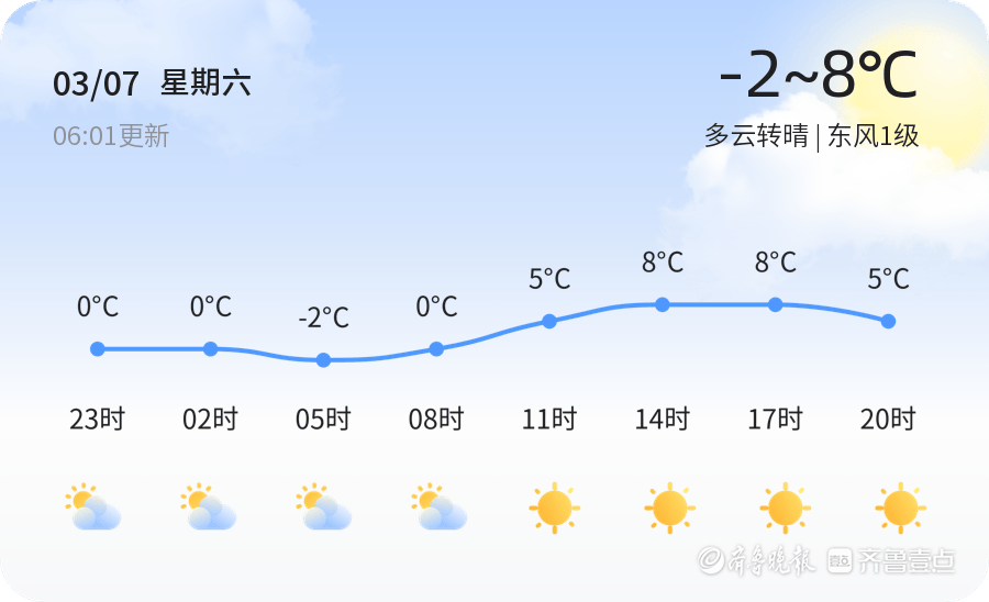今日是2026年3月7日,星期六,农历正月十九。淄博市迎来多云转晴的好天气,气温范围在-2°C至8°C之间,东风1级,空气湿度达到90%。PM2.5指数为78,空气质量状况良好,适合户外活动。市民出行时建议根据实时温度增减衣物,以适应温差变化。