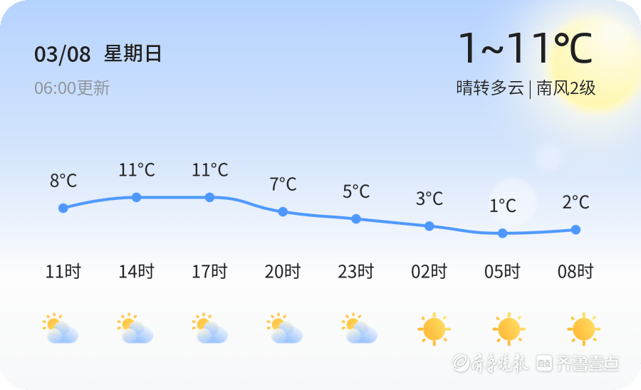 今天是2026年3月8日,星期日,农历正月二十,济南迎来一个晴朗的妇女节。今天的天气为晴转多云,气温介于1℃至11℃之间,南风2级,空气湿度为46%,空气质量良好(PM2.5为58)。市民朋友们可以放心外出活动,但请注意早晚温差较大,出行时建议增添衣物,以适应气温变化。今天也是国际妇女节,这是一个庆祝女性成就并倡导性别平等的重要日子。妇女节起源于20世纪初的劳动运动,如今已成为全球性的节日。我们提醒市民朋友们在这一天给予女性更多的关爱与尊重,共同营造和谐的社会氛围。