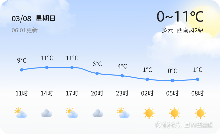 今天是2026年3月8日,正月二十,淄博的天气以多云为主,气温在0℃至11℃之间,西南风2级,空气湿度为50%。当前PM2.5指数为55,空气质量状况为良,适合户外活动。今天也是国际妇女节,是全球女性争取平等、正义和尊严的重要日子。市民可以趁着良好的天气,与家人朋友一同庆祝这个特殊的节日。
