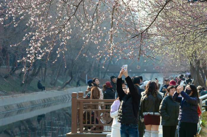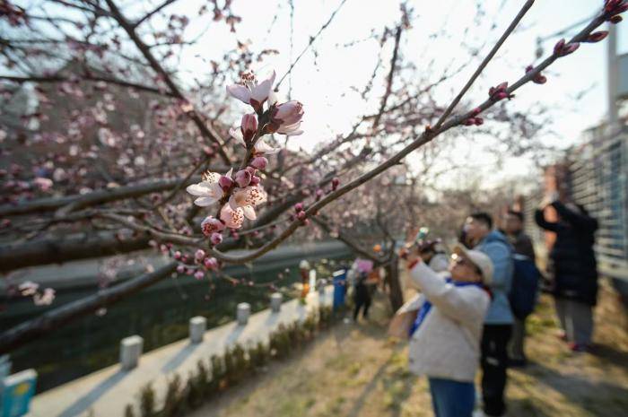 3月8日,雪后的北京天气晴朗,十里堡的山桃花盛开,吸引了许多市民前来打卡拍照,享受周末的美好时光。