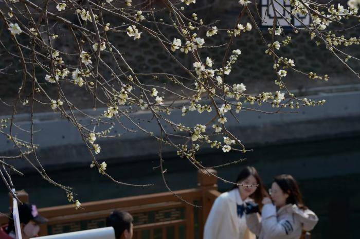 花香阵阵中,游人赏春拍照。