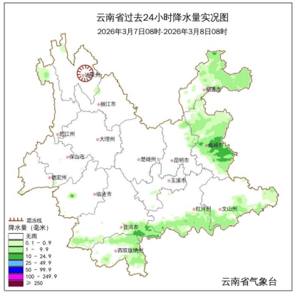 3月7日,曲靖市南部、普洱市东南部出现小到中雨局部大雨,昭通市、昆明市东北部、文山州南部、红河州南部、西双版纳州、普洱市西南部、怒江州西北部出现小雨,其他地区多云间晴。