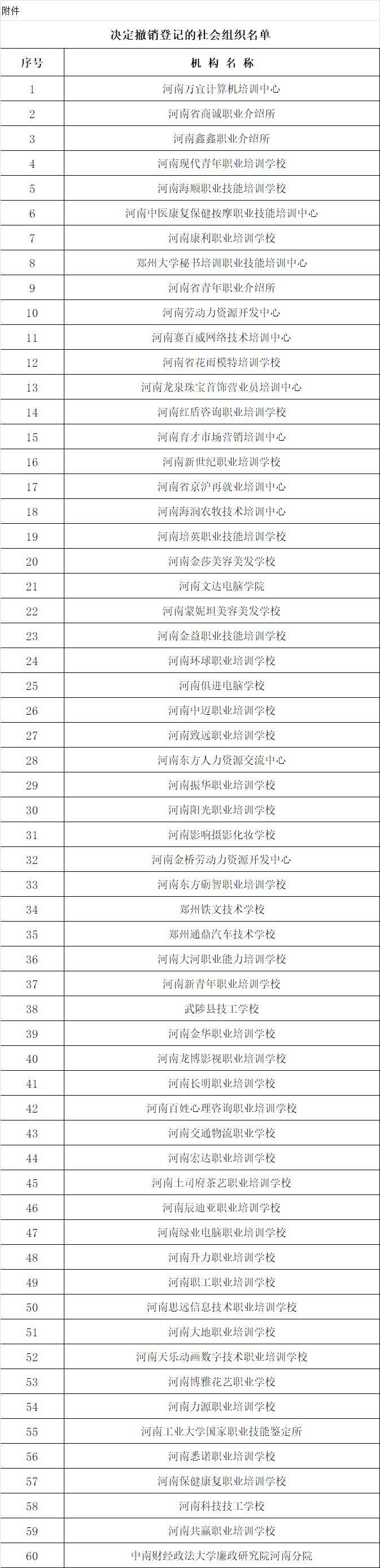 经调查,河南万宜计算机培训中心等社会组织(见附件)连续两年以上不接受登记管理机关年度检查,上述社会组织的行为违反了《民办非企业单位登记管理暂行条例》第二十三条第一款、《民办非企业单位年度检查办法》第三条第一款的规定。依据《民办非企业单位登记管理暂行条例》第二十五条第一款第(三)项、《民办非企业单位年度检查办法》第十条之规定,本机关决定对上述社会组织作出撤销登记的行政处罚。同时依据《社会组织信用信息管理办法》第十五条第七项的规定,将上述社会组织列入严重违法失信名单。
