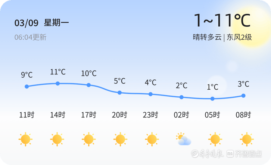 今天是3月9日,星期一,农历正月廿一。泰安市今日天气晴转多云,气温在1℃至11℃之间,东风2级,空气湿度为65%,PM2.5浓度为137,空气质量等级为轻度污染。市民外出时建议佩戴口罩,以减少空气污染对健康的影响。此外,由于今日气温较低,早晚温差较大,市民应注意保暖,适时增减衣物。出行时可选择轻便外套,以应对多变的天气。