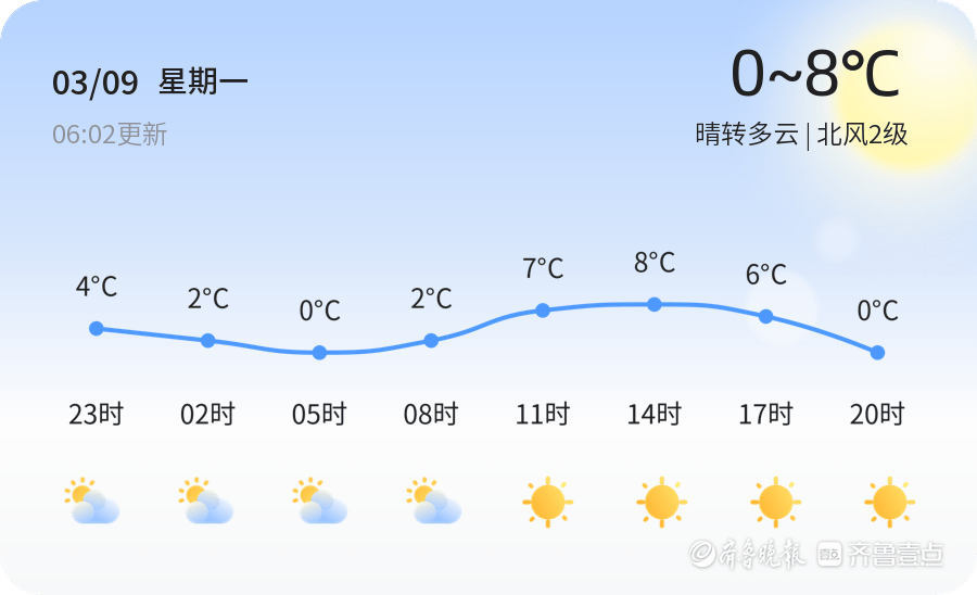 今日是2026年3月9日,正月廿一,东营市迎来晴转多云的天气,气温介于0℃至8℃之间,北风2级,空气湿度56%,空气质量良好(PM2.5指数为72)。早晨气温较低,市民出行时请注意保暖,适时添加衣物。由于天气晴朗,市民可以享受明媚的春光,但建议随身携带雨具,以防天气突变。